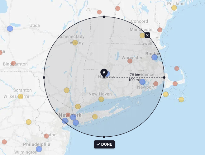 If there are no options at your local airport, see if you can get to another airport. Hartford’s closest large airports are JFK and LaGuardia in New York City, as well as further up in Boston. Both are accessible via passenger rail, so I began looking for options to potentially take the train to the airport. The premium version of FlightConnections makes this easy by letting you draw a large radius around your area in order to catch all relevant airports, allowing you to see all possible connections home.